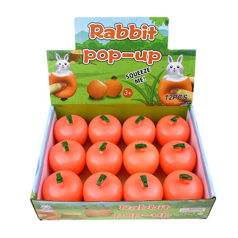 The toys are described as plastic stress relief fidgets, designed to “squish” like a rabbit popping up from a carrot — a tactile fidget with novelty appeal Alibaba.
